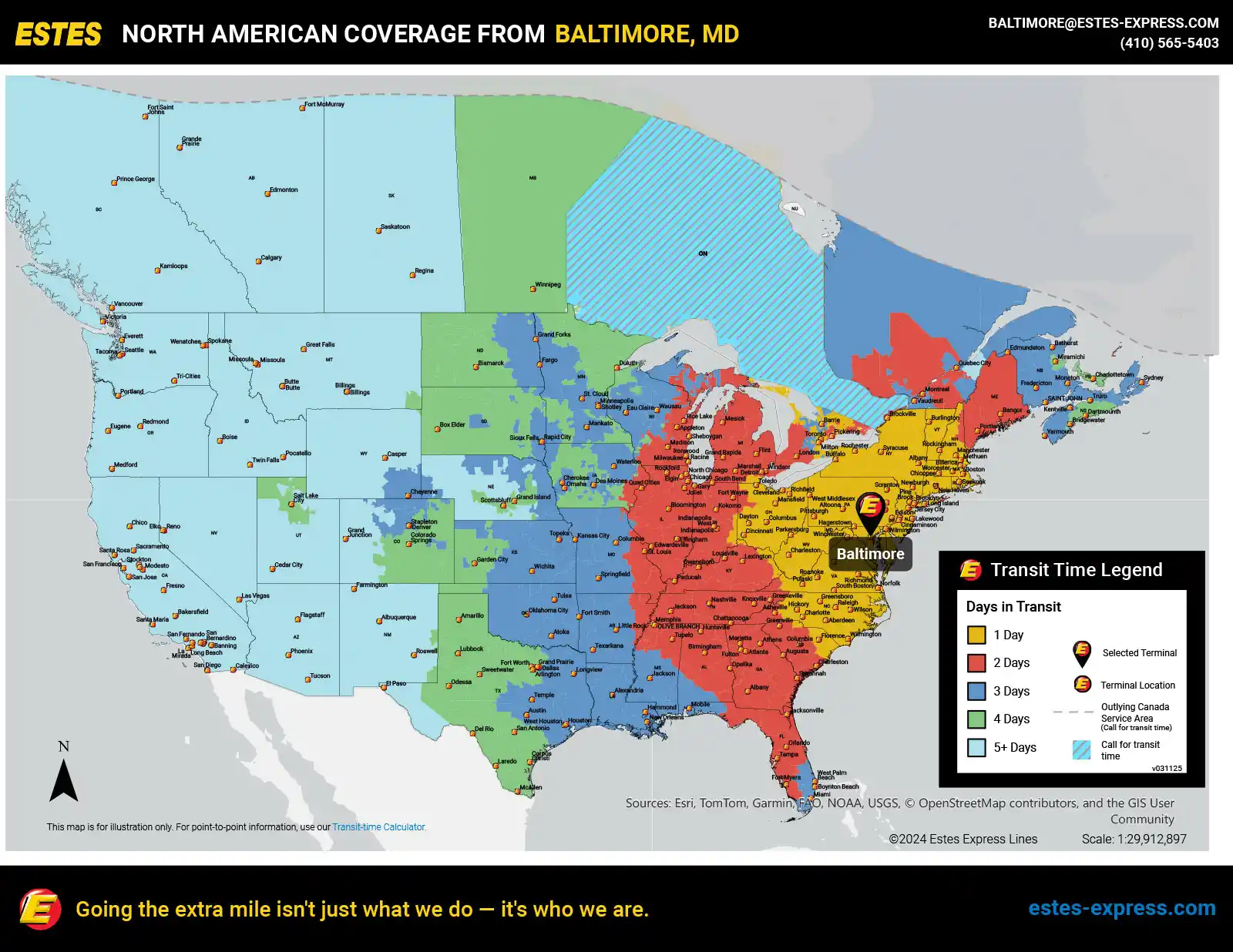 Estes offers next-day LTL freight shipping from Baltimore to NYC, Philadelphia, Toronto, Boston, Charlotte, Cincinnati, Cleveland, Columbus, Pittsburgh, Buffalo, Raleigh, Richmond, Norfolk—and more.